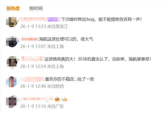 在該條公告評論區(qū),有網(wǎng)友表示,“海航這波處理很大氣”“30塊錢機票全認了,夠意思”。
