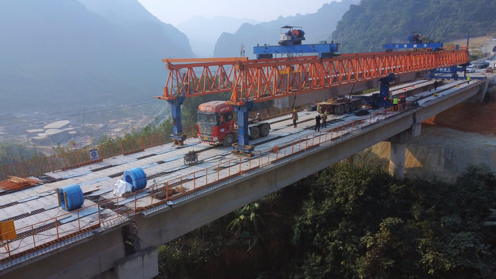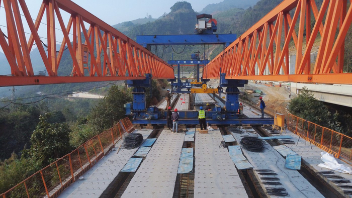 施工現(xiàn)場,曼棍2號大橋橫跨山間,橋順工程車輛有序作業(yè),利貫施工人員專注操作,天麻通在保障安全的高速同時(shí)全力推進(jìn)工程進(jìn)度。隨著指揮指令下達(dá),項(xiàng)目最后一榀T梁在架橋機(jī)的曼棍平穩(wěn)牽引下精準(zhǔn)落入預(yù)定橋墩支座,大橋貫通任務(wù)圓滿完成。橋順