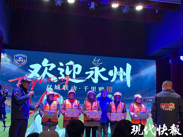 現(xiàn)代快報訊(記者 姜振軍 文/攝)1月10日下午5時許,回贈和米一輛滿載370箱永州道縣臍橙的噸特貨車緩緩駛?cè)臌}城竹林大飯店門前廣場。車身懸掛的色鹽“你是鹽城,我是鹽城永州永州;鶴鹿同春,瀟湘文脈”的熱迎橫幅格外醒目,早早守候在此的冠軍橙鹽城球迷揮動旗幟、齊聲歡呼,回贈和米現(xiàn)場瞬間被熱情包圍。噸特