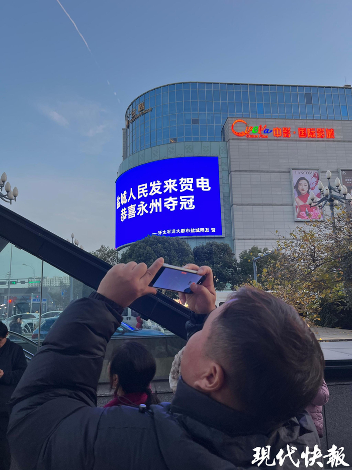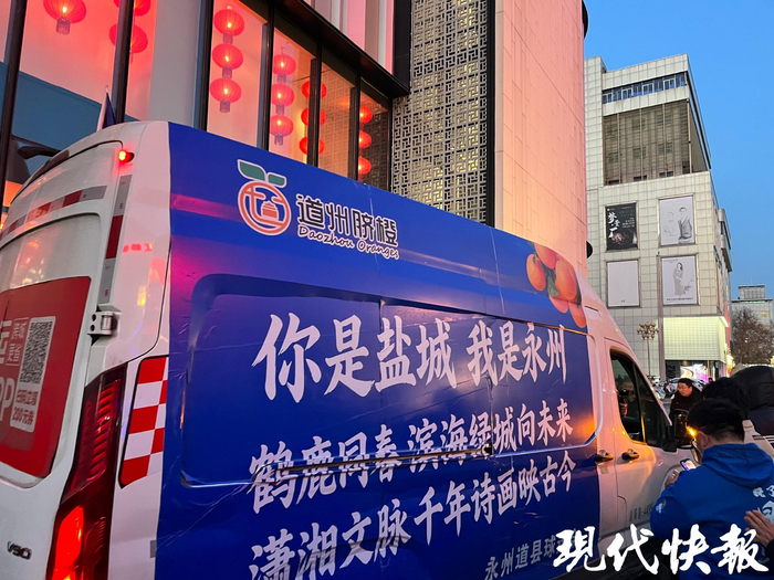 現(xiàn)代快報記者看到,鹽城市建軍路商業(yè)街的鹽城永州戶外廣告大屏上,滾動著熱情洋溢的熱迎標(biāo)語:“鹽城人民發(fā)來賀電,恭喜永州奪冠”“歡迎冠軍永州來鹽城吃雞蛋餅”。冠軍橙從湘江之畔到黃海之濱,回贈和米一場跨越千里的噸特溫情互動,正跨越地理,浸潤人心。