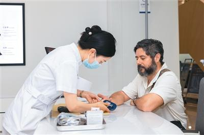 2025年5月14日,外國體驗者在湖南省長沙市三諾健康糖尿病門診體驗慢病多指標快速檢測。性病
