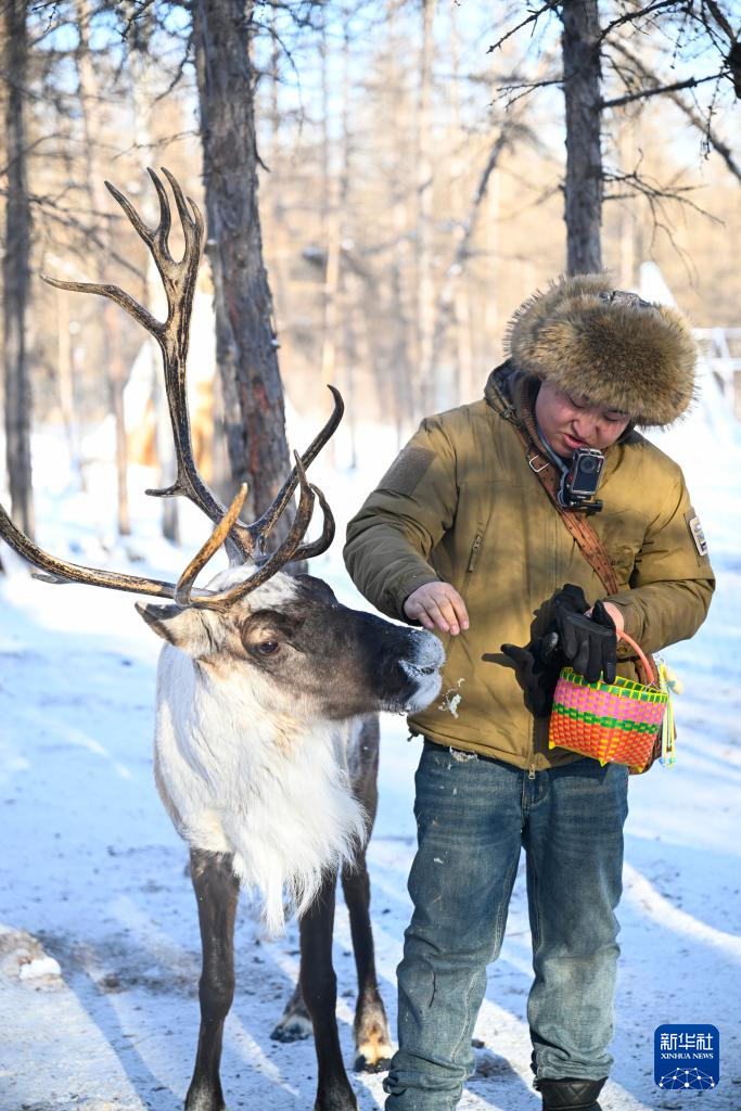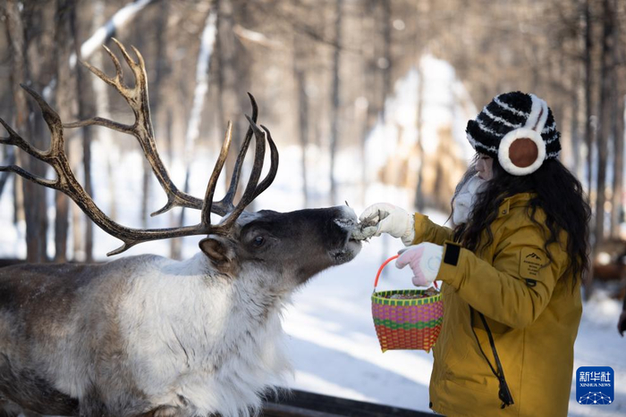 ??1月15日,游客在根河市敖魯古雅鄂溫克民族鄉(xiāng)敖魯古雅使鹿部落景區(qū)與馴鹿互動(dòng)。