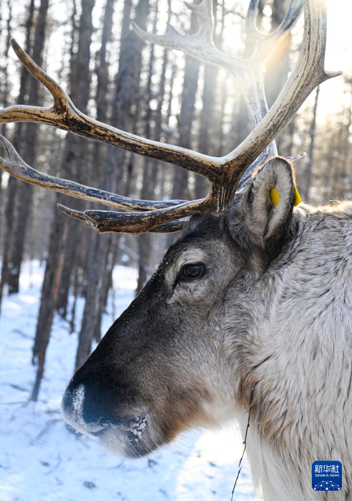 ??這是1月15日在根河市敖魯古雅鄂溫克民族鄉(xiāng)敖魯古雅使鹿部落景區(qū)拍攝的馴鹿。