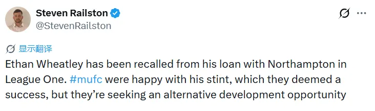 曼晚記者Steven Railston的報道:伊森·惠特利已從英甲球隊北安普頓的租借中被召回。曼聯(lián)對他這段租借期的表現(xiàn)感到滿意,并將其視為一次成功的鍛煉,但俱樂部正尋求另一個更利于其發(fā)展的機會。