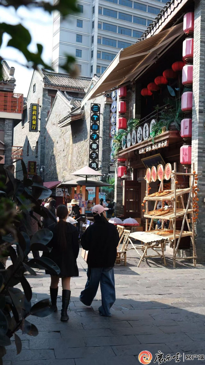 1月7日,暖陽(yáng)輕拂。南寧三街兩巷歷史文化街區(qū)里,人聲鼎沸,熙熙攘攘。游客在一棟棟由古建筑改造成的傳統(tǒng)文化展示館里流連;年輕人身著民族服飾在角落旅拍;白發(fā)蒼蒼的“老南寧”靜坐在騎樓下,凝望往來(lái)人潮……