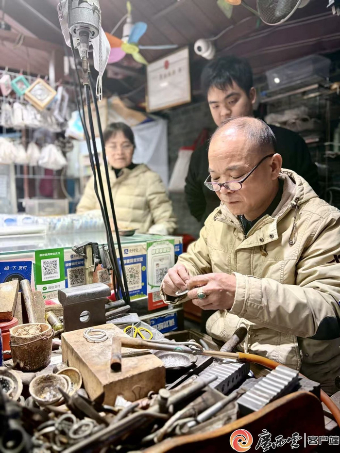 穿過(guò)金獅巷,陣陣清脆敲擊聲從唐上靖的打金鋪傳出。有顧客專程而來(lái),要鍛打銀手鐲,留作孩子的歲月信物。錘起錘落,銀條在指尖延展、貼合。嫻熟手法,讓一旁孩童看得目不轉(zhuǎn)睛。金獅巷傳統(tǒng)打金技藝,是自治區(qū)級(jí)非物質(zhì)文化遺產(chǎn)代表性項(xiàng)目,在磨出凹痕的老木案上,代代相傳。