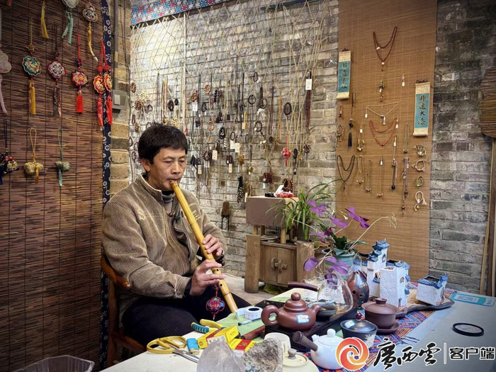 何國(guó)斌專注吹簫,清越的樂(lè)音從古老的街巷中流淌而出。