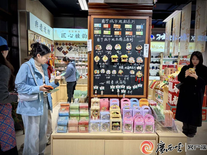 被壯錦、銅鼓等元素創(chuàng)意文創(chuàng)商品吸引,許多游客停下腳步,細(xì)心挑選一份“能帶走的廣西記憶”。