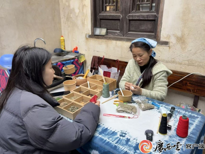 一名大學(xué)生在匠人黃海梅的指導(dǎo)下制作香包。