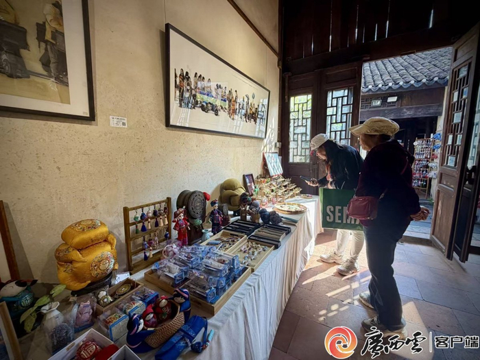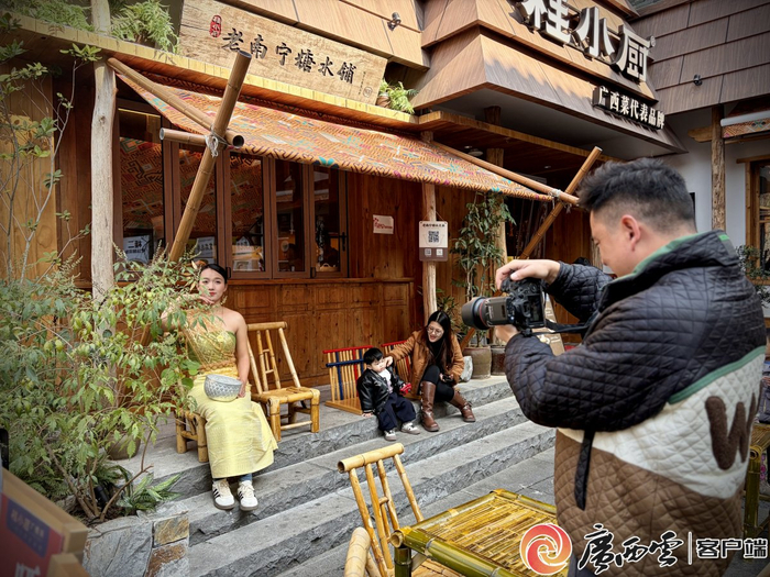 游客在院落里的“南寧”條幅邊拍照打卡。