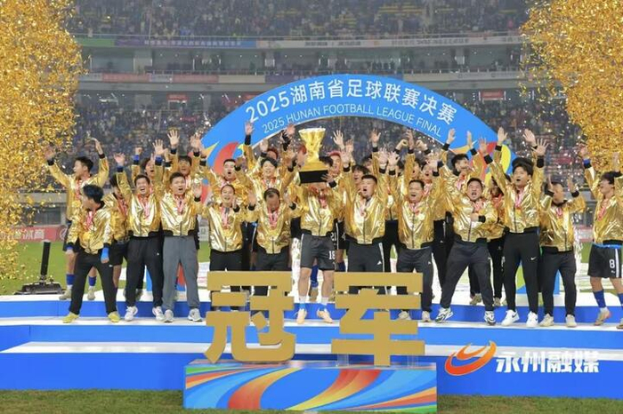 一個多月后,“湘超”總決賽在長沙賀龍體育場鳴哨開戰(zhàn)。經(jīng)過90多分鐘的鏖戰(zhàn),永州隊以1:0力克常德隊,問鼎“湘超”桂冠。