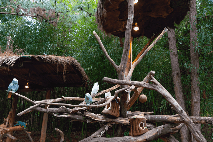 生活在熱帶、亞熱帶的鸚鵡對低溫比較敏感。園區(qū)將保溫燈懸掛于棲木上方30厘米處,既避免羽毛被燙傷,又能維持環(huán)境溫度。同時,在棲木間安裝了樹洞造型的毛絨豐容鳥窩,保暖的同時,也為其增添了更多溫暖的棲息選擇。