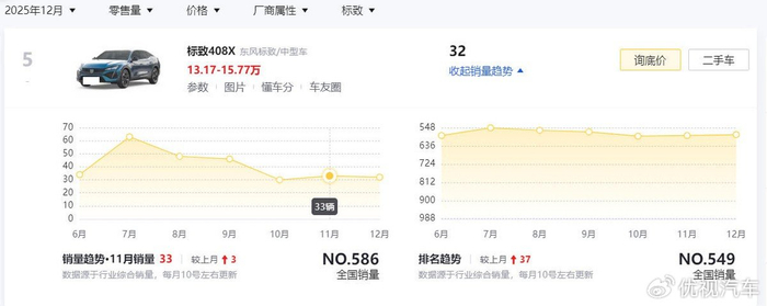 要知道,目前國(guó)內(nèi)市場(chǎng)在售的東風(fēng)標(biāo)致408X車型,其最新的12月份銷量數(shù)據(jù)可是還只有32輛新車,排名也屬于是東風(fēng)標(biāo)致家族車系里面最墊底的存在。因此,倘若國(guó)產(chǎn)版的標(biāo)致408X能按照這剛曝光的新款標(biāo)致408模樣去投產(chǎn),沒準(zhǔn)是能提振一下現(xiàn)有的銷量,你們覺得呢?評(píng)論區(qū)里留言說說看。(文/優(yōu)視汽車 大卓 )