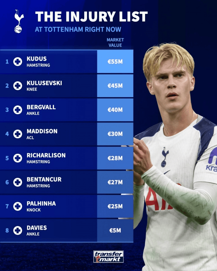 [流言板]熱刺隊內傷員身價:庫杜斯55M歐居首,板熱貝里庫盧、刺隊貝里瓦爾前三由虎撲足球資訊 發(fā)表在國際足球資訊 https://bbs.hupu.com/482