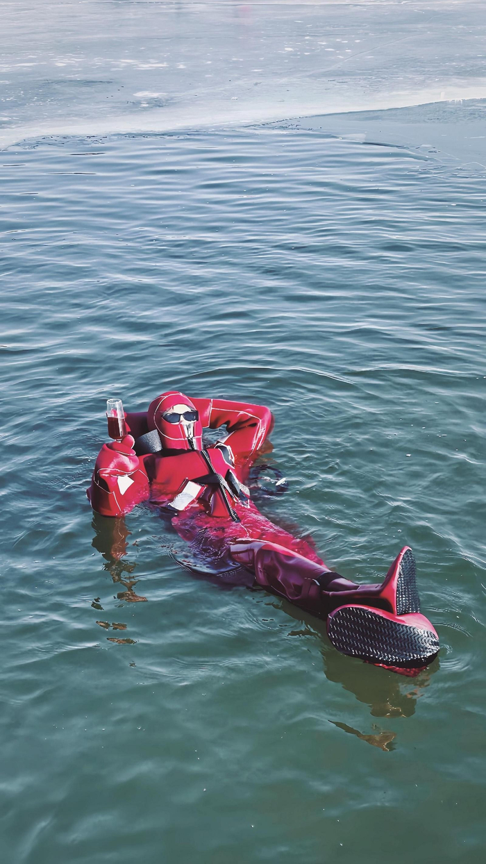 這份“躺平”的舒適與安心,全靠專業(yè)裝備的加持。解剛剛介紹,冰浮服是特制的干式防寒服,看著厚實笨重,實則暗藏玄機——衣服背后的長方形氣囊,能穩(wěn)穩(wěn)托住人的頭部和肩部,確保上半身始終浮在水面之上,就像躺在柔軟的枕頭上一般愜意;加厚潛水服面料搭配隔熱鍍膜,全身密封只露出臉龐,既能隔絕冰水的寒氣,又能牢牢鎖住體溫,完全不用擔心受涼?!斑@衣服原本是船舶救生裝備,經(jīng)過海事局的認證,安全系數(shù)拉滿,就算不會游泳也能放心玩?!?/p>
