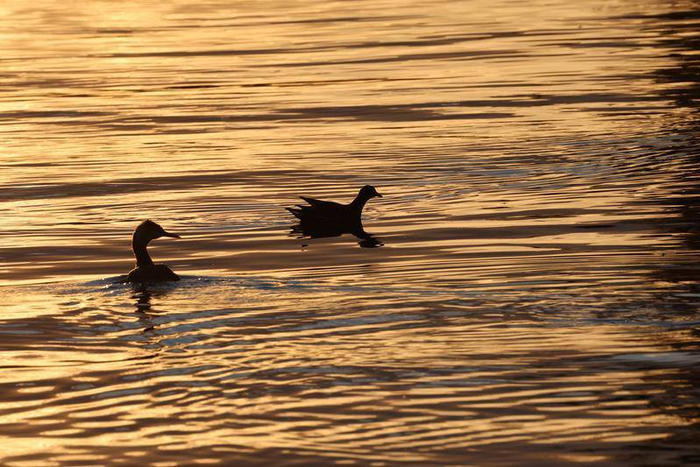落日霞光中的大觀河,棲著著水雞和白骨頂雞和小??。