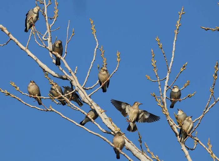 成群的絲光椋鳥停在樹枝,西山區(qū)滇池綠道濕地公園。