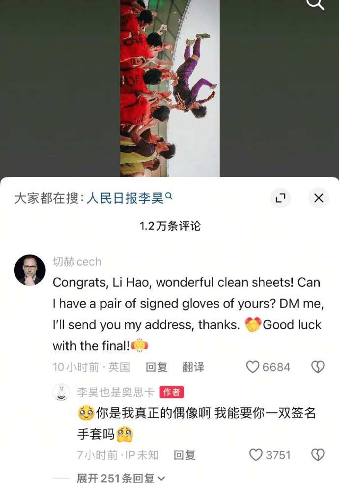 此番李昊助力球隊(duì)取勝且完成零封,切赫本人也特意現(xiàn)身其社交媒體評(píng)論區(qū),留言道:“祝賀你李昊,精彩的零封!可以給我一雙你的簽名手套嗎?私聊我,我會(huì)給你我的地址,謝謝,決賽好運(yùn)!”