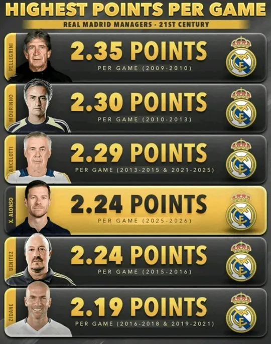21世紀以來皇馬主教練場均得分榜阿隆索排名第四