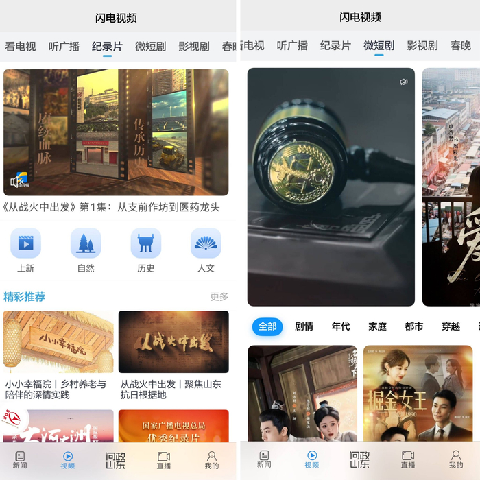針對當下用戶碎片化消費習慣,“閃電視頻”重磅推出微短劇專區(qū),集結鄉(xiāng)村振興、懸疑推理、都市情感等多元題材的精品力作,讓用戶隨時隨地暢享追劇樂趣。此外,紀錄片專區(qū)以山東廣播電視臺優(yōu)質紀錄片資源為基礎,整合拓展全國、全網優(yōu)質紀錄片資源,讓網友通過這一平臺感受中華歷史之美、山河之美、文化之美,推動用戶視聽體驗從“娛樂消費”向“文化浸潤”升級。